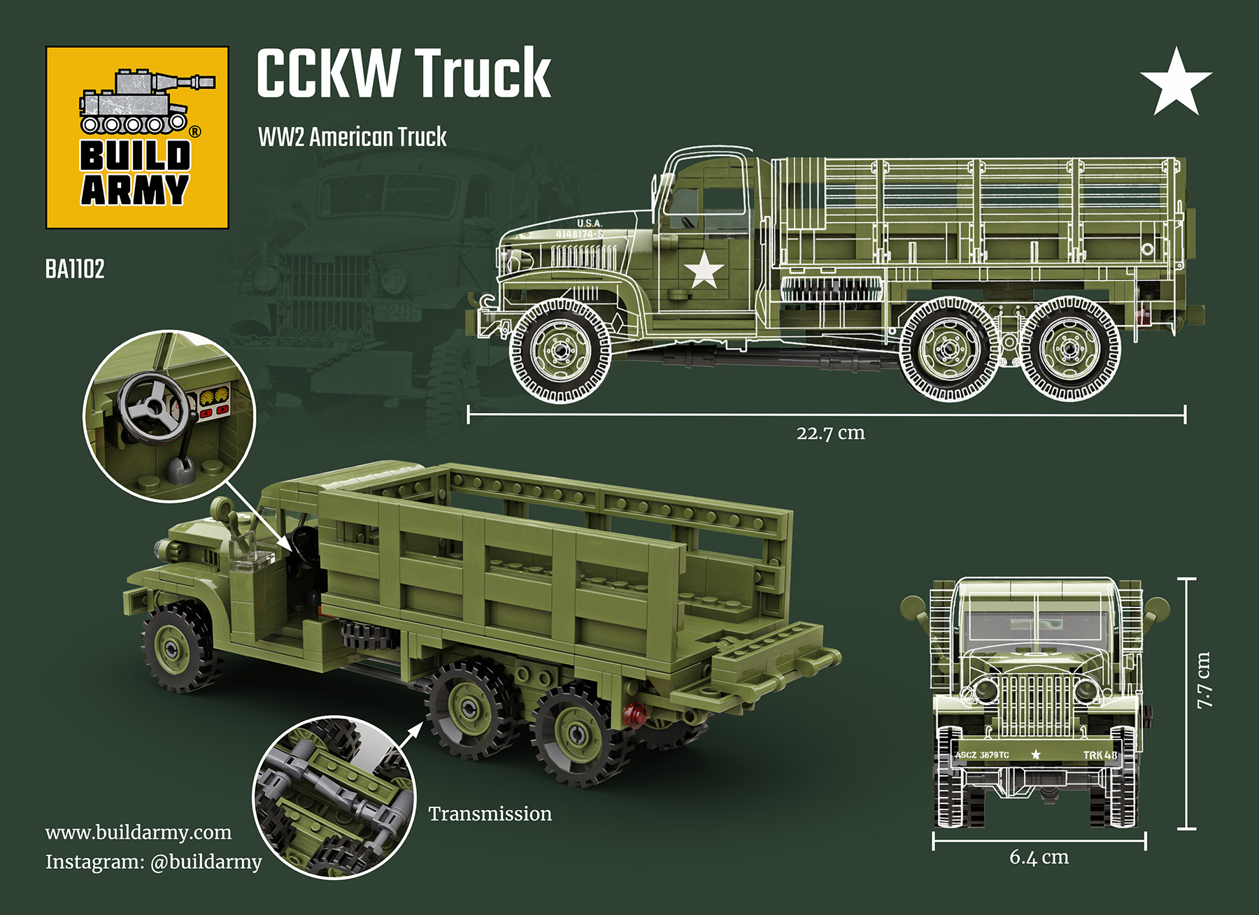 The GMC CCKW U.S. Army cargo truck, the original “Deuce and a Half”, was the working horse that kept Allied armies supplied after the Normandy invasion. The designation CCKW comes from standard GMC terminology: C for a 1941 model year; C for a conventional cab configuration; K for selective front-wheel drive; and W for two powered rear axles. Its development began in 1939 and the US Army specified this size because it has the truck fit on Navy ships and was also suited for mass production.