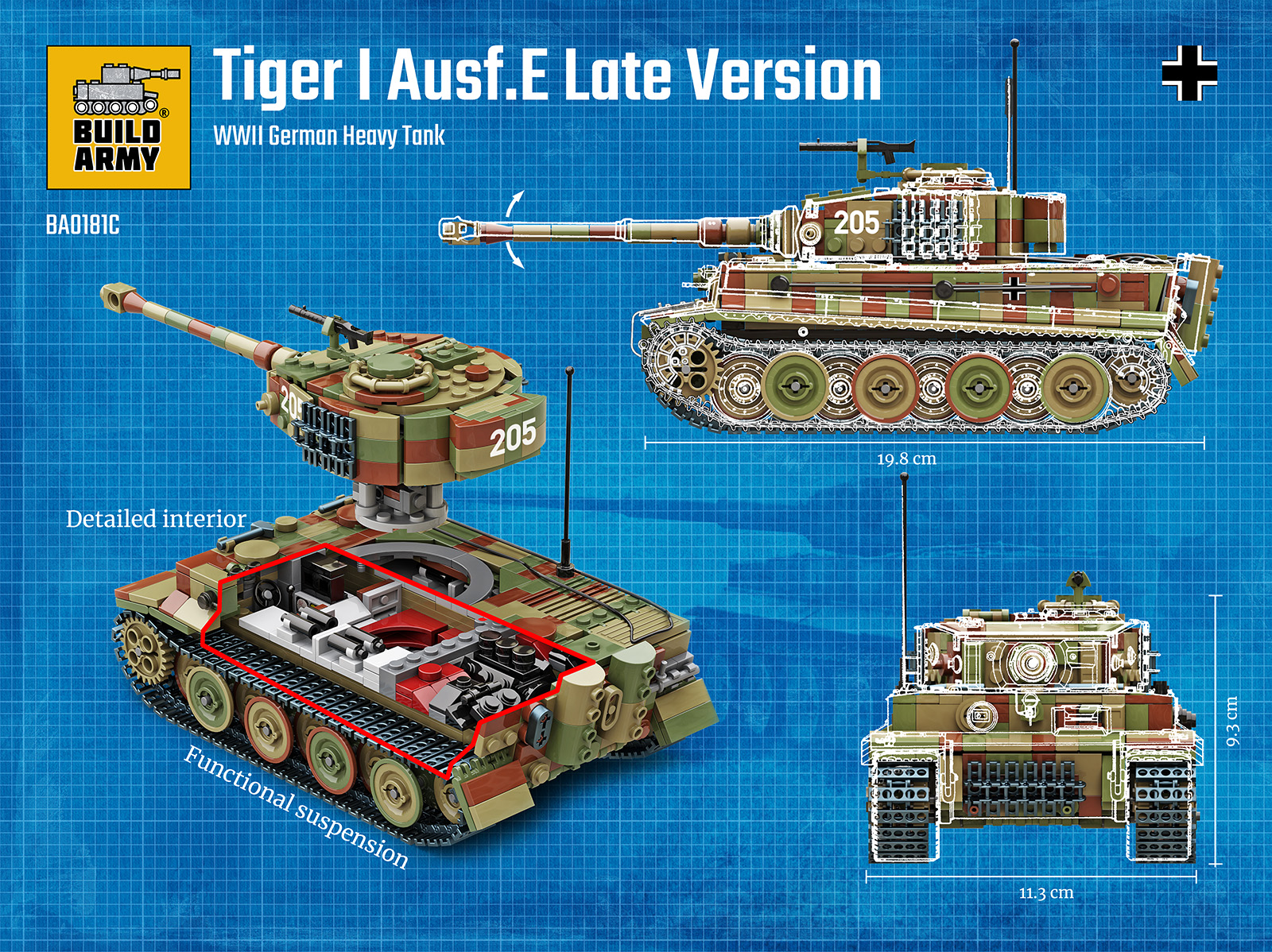 With 1153 bricks, this kit captures all the iconic features of the Tiger 1, from the distinctive horseshoe curve of the turret to the robust, boxed chassis. Every angle of the model reflects the tank’s legendary design, making it instantly recognisable. Beyond the exterior, the model is also equipped with a simplified and interesting interior within the hull, featuring driver seats, a turret basket, an ammo rack, and an engine compartment housing a Maybach engine. The open-up design makes it easy to dismantle and explore those inner features. It also has working suspension for realistic play.
