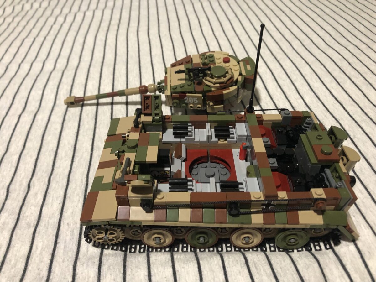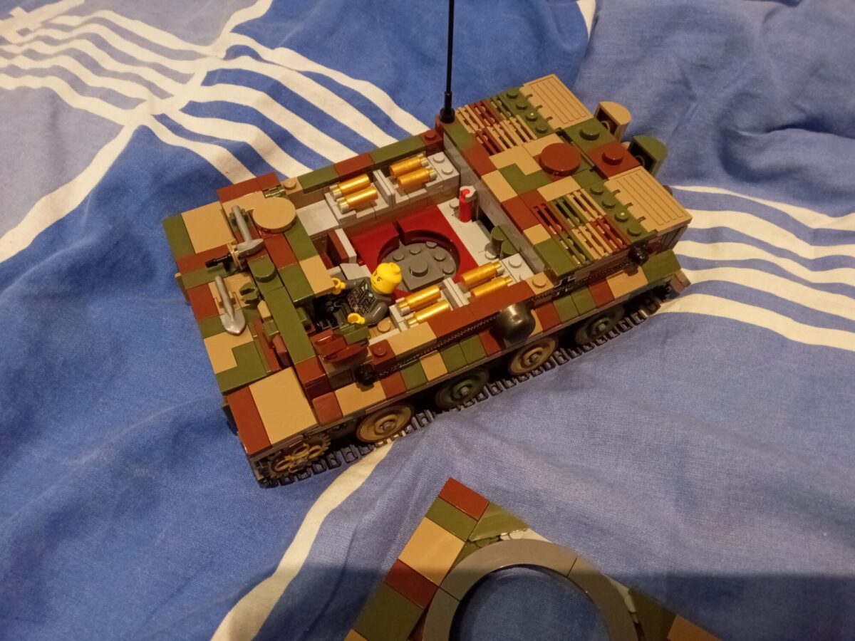 I was able to fit a mini-figure in the radio operators hatch with some modifying. I replaced the 4 x 2 tile that is between both of the hatches with two 2 x 2 tiles to make them fit. I’ve also changed the green bracket the holds the handle inside the tank (the mg handle) to be reversed/flipped to the opposite piece, and halfed it like in the pictures as well as taking out the mg handle completely. This can be done with the spare parts of the model, although I do not display it like this, this would be better for any stop motions or dioramas.