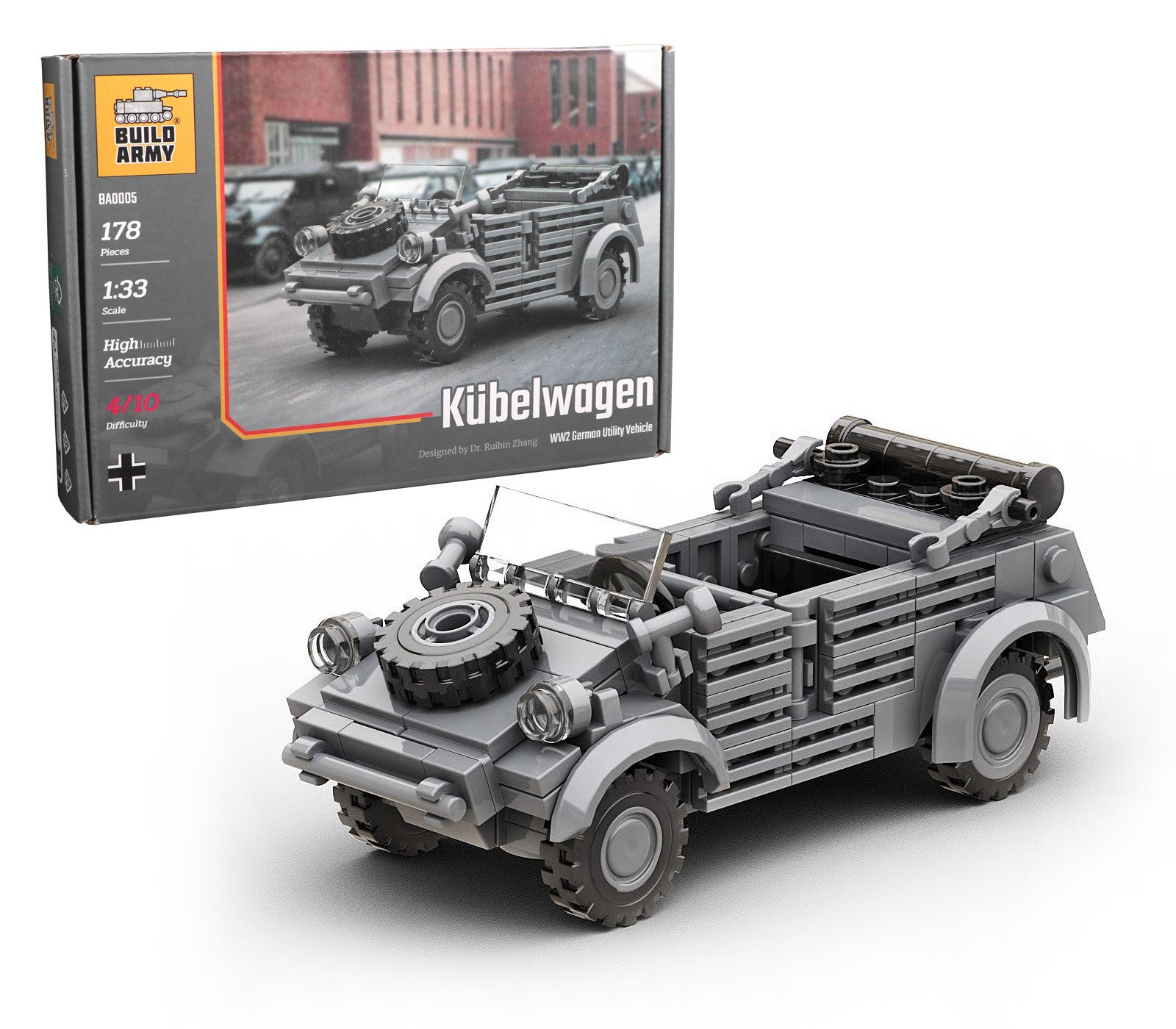Our Buildarmy WW2 German Kübelwagen is a detailed brick replica of the iconic WWII utility car. It features opening doors, a rear brick-built engine, and room for two minifigures. Small in size but big on detail! Our Kübelwagen’s authentic design and smooth build make it a standout piece for any collection.